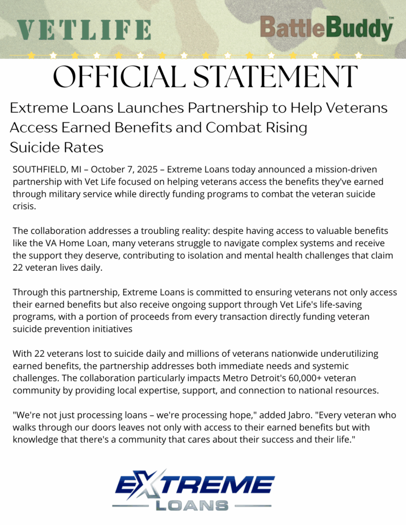 Extreme Loans Launches Partnership to help veterans access earned benefits and combat rising suicide rates